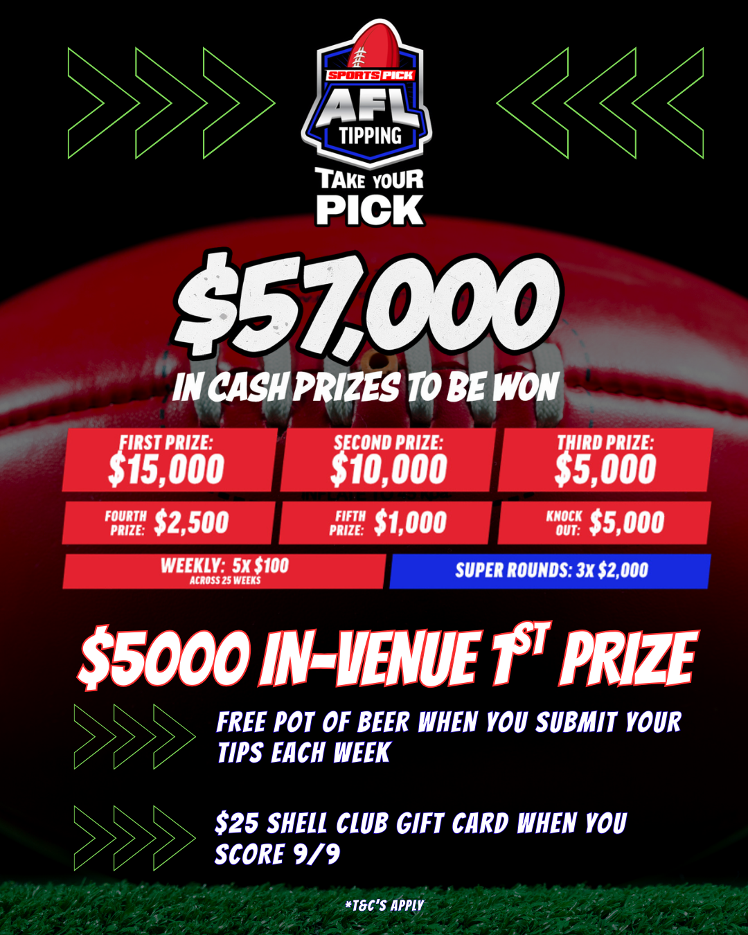 What better way to enjoy the 2026 AFL season than with SportsPick’s AFL Super Tipper and a massive $57,000 prize pool? Dominate your local round to qualify for one of three high-stakes Super Rounds, where $2,000 is on the line and the best footy tippers go head-to-head for glory.
